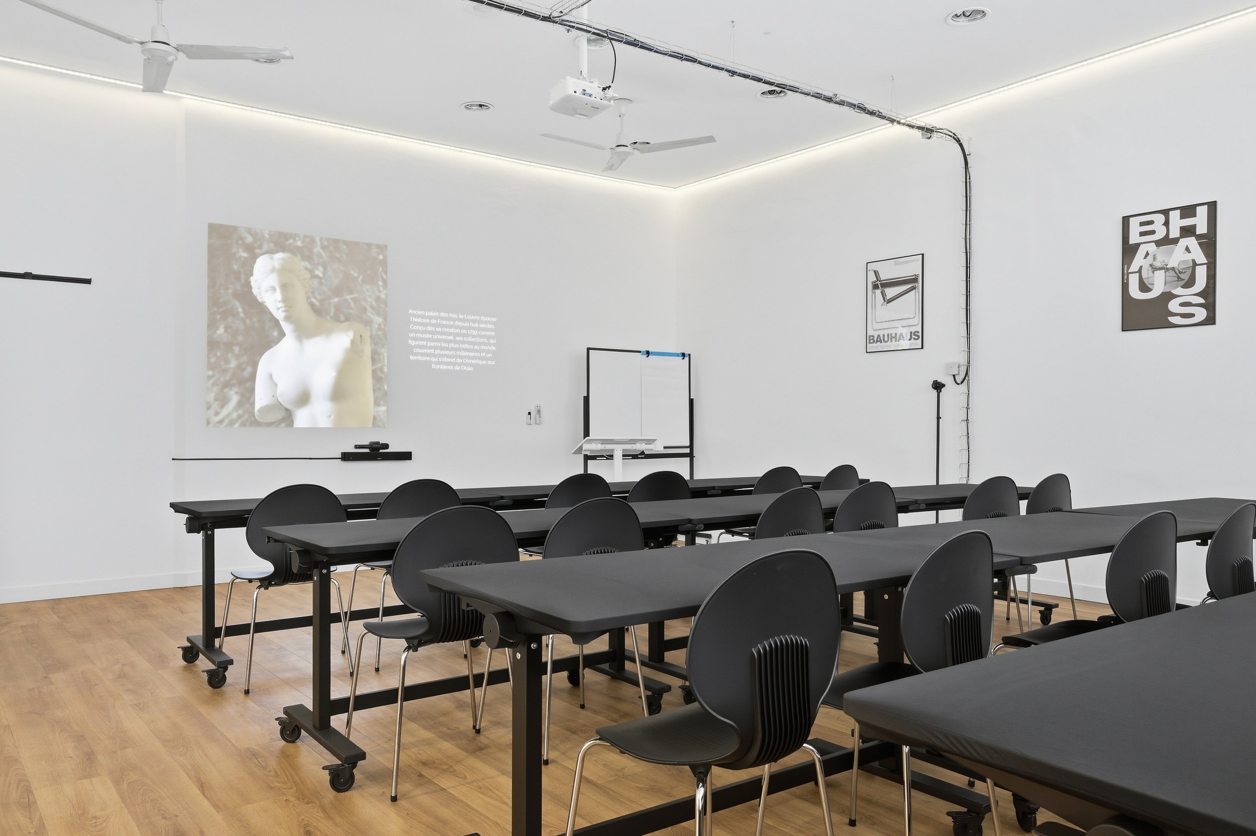 La salle peut être aménagée en U pour favoriser les interactions, ou en salle de classe pour les sessions de travail plus structurées.