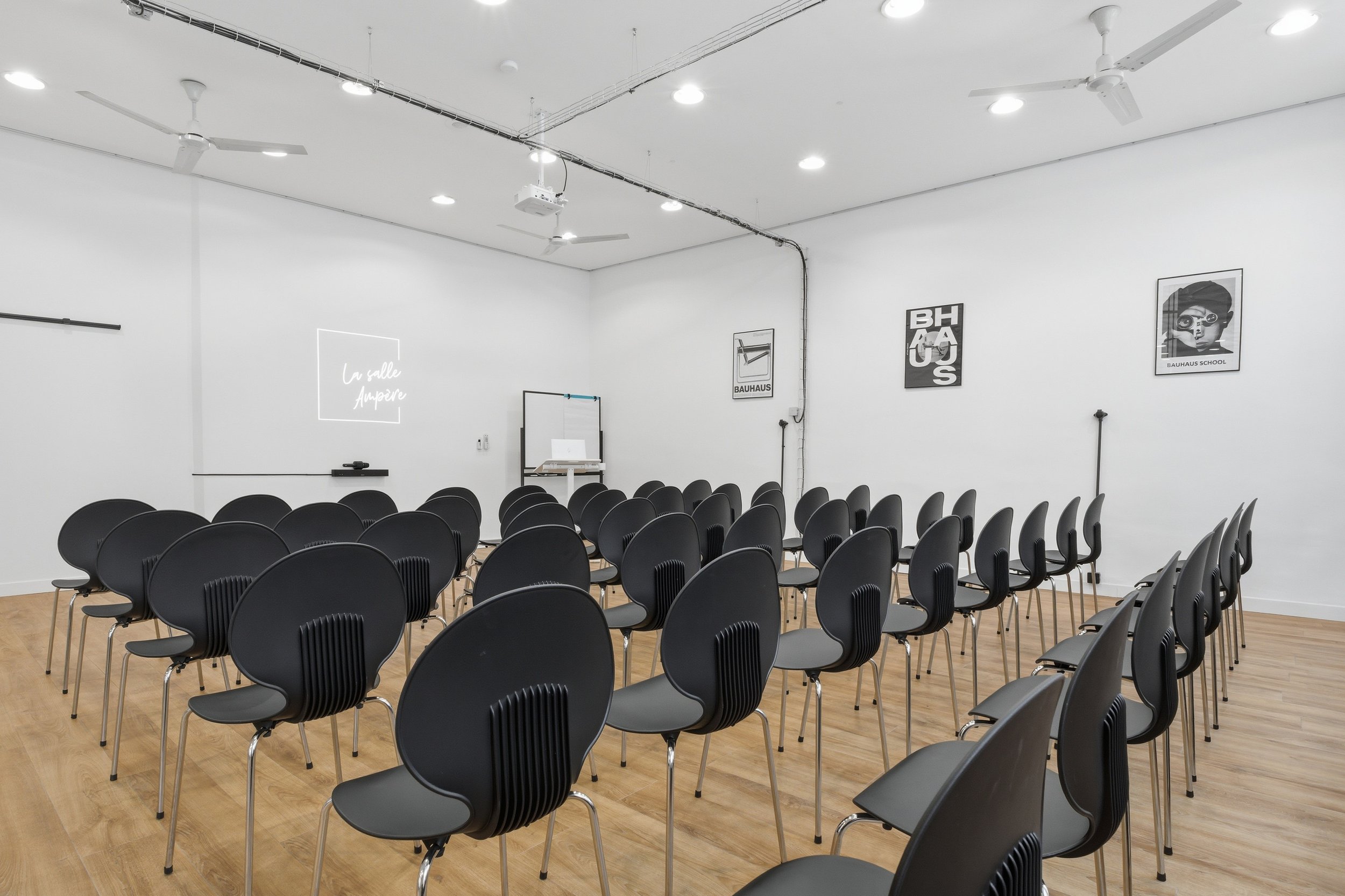 Grâce à son équipement audiovisuel complet et à sa grande banquette au fond de la salle, La Salle Ampère offre un cadre à la fois professionnel et chaleureux, propice à la concentration et aux échanges.